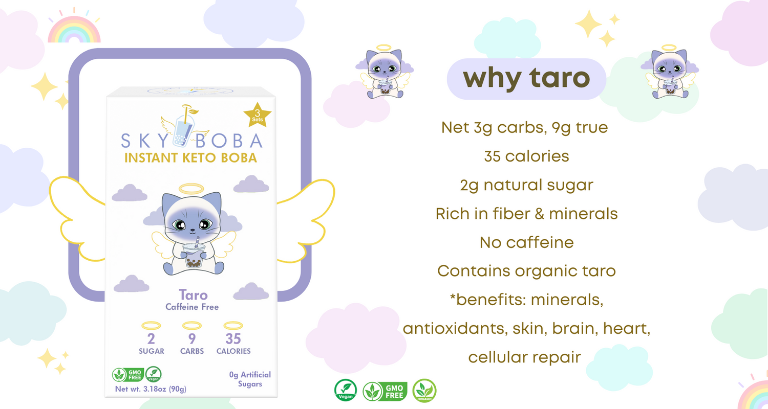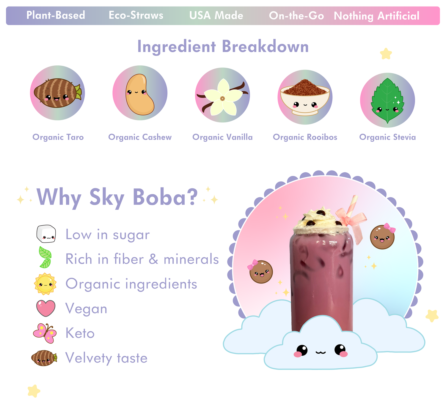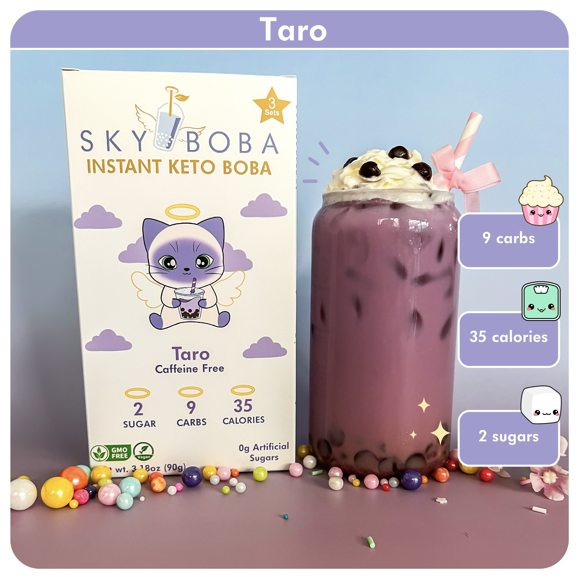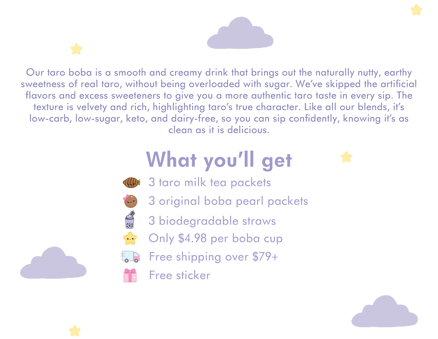 Our taro boba is a smooth and creamy drink that brings out the naturally nutty, earthy sweetness of real taro, without being overloaded with sugar. We've skipped the artificial flavors and excess sweeteners to give you a more authentic taro taste in every sip. The texture is velvety and rich, highlighting taro's true character. Like all our blends, it's low-carb, low-sugar, keto, and dairy-free, so you can sip confidently, knowing it's as clean as it is delicious.