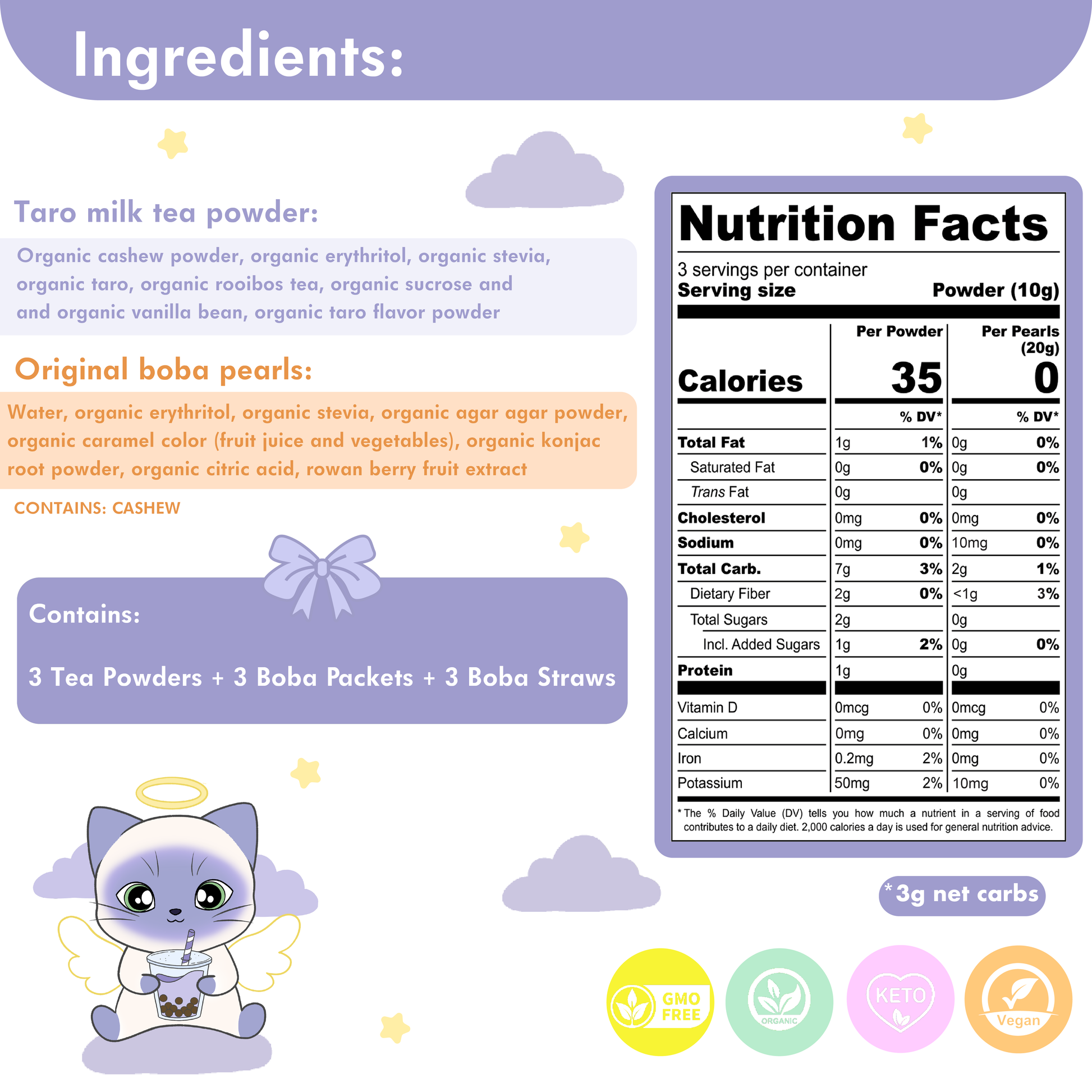Organic cashew powder, organic erythritol, organic stevia, organic taro, organic rooibos tea, organic sucrose and organic vanilla bean, organic taro flavor powder (Vegan) (Contains: cashew)